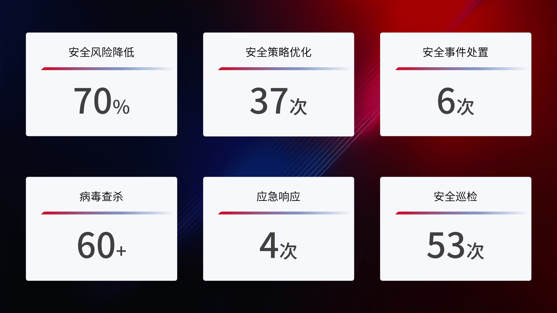 提供全面的安全事件报告体系,,,包括处置报告、、、周报、、、、季度和年度总结,,结合持续监控,,,帮助客户深入了解网络安全状况。。。。
